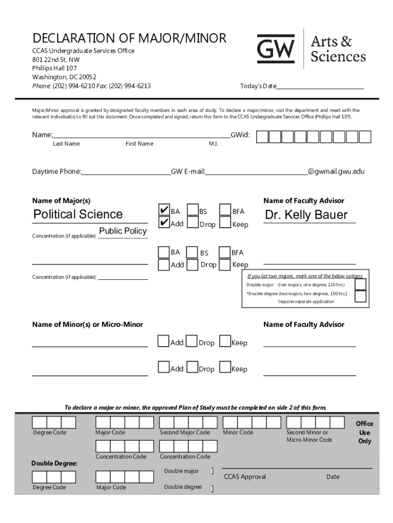 DECLARATION OF MAJOR/MINOR CCAS Undergraduate Services Office 801 22nd St, NW Phillips Hall 107 Washington, DC 20052 Phone: (202) 9946210 Fax: (202) 9946213Todays DateMajor/Minor approval is granted