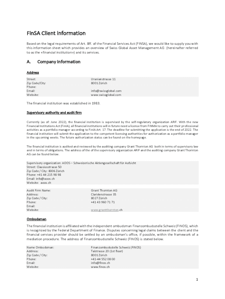 The Finsa Client Information Form is a critical tool designed to gather essential data from clients during the onboarding process. Its primary purpose is to facilitate effective financial assessments and ensure that the services provided align with the client's needs and preferences. The form plays a significant role in the financial services landscape by streamlining the collection of important information, ultimately leading to enhanced client relationships and successful financial outcomes.