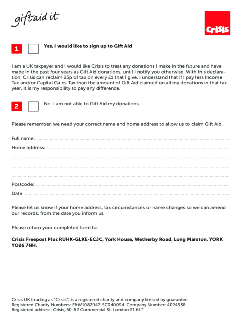 1Yes, I would like to sign up to Gift AidI am a UK taxpayer and I would like Crisis to treat any donations I make in the future and have made in the past four years as Gift Aid donations, until I