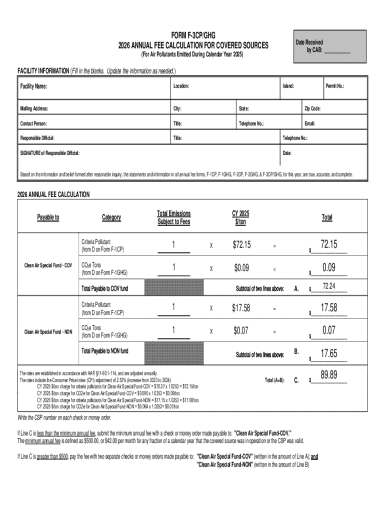 FORM F3CP/GHG 2026 ANNUAL FEE CALCULATION FOR COVERED SOURCESDate Received by CAB: ___(For Air Pollutants Emitted During Calendar Year 2025)FACILITY INFORMATION (Fill in the blanks. Update the information