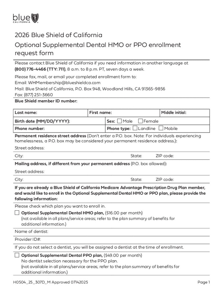 Get the free 2026 Blue Shield of California Optional Supplemental Dental HMO or PPO enrollment re...