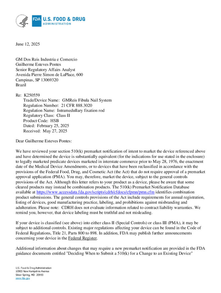 June 12, 2025GM Dos Reis Industria e Comercio Guilherme Esteves Pontes Senior Regulatory Affairs Analyst Avenida Pierre Simon de LaPlace, 600 Campinas, SP 13069320 Brazil Re: K250559 Trade/Device