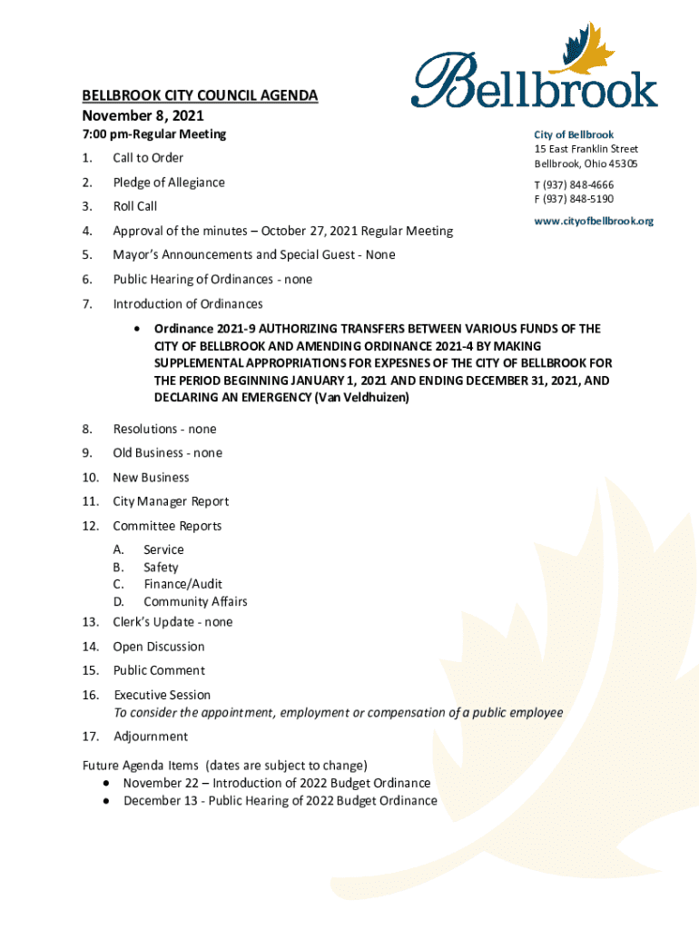 BELLBROOK CITY COUNCIL AGENDA November 8, 2021 7:00 pmRegular Meeting 1.Call to Order2.Pledge of Allegiance3.Roll Call4.Approval of the minutesOctober 27, 2021 Regular Meeting5.Mayors Announcements
