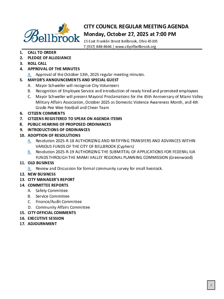 CITY COUNCIL REGULAR MEETING AGENDA Monday, October 27, 2025 at 7:00 PM 15 East Franklin Street Bellbrook, Ohio 45305 T (937) 8484666 | www.cityofbellbrook.org1. 2. 3. 4.CALL TO ORDER PLEDGE OF ALLEGIANCE