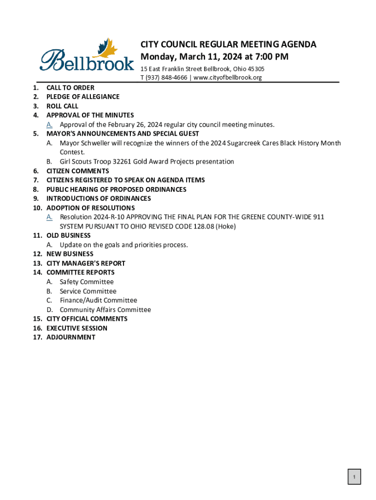 CITY COUNCIL REGULAR MEETING AGENDA Monday, March 11, 2024 at 7:00 PM 15 East Franklin Street Bellbrook, Ohio 45305 T (937) 8484666 | www.cityofbellbrook.org1. 2. 3. 4.CALL TO ORDER PLEDGE OF ALLEGIANCE