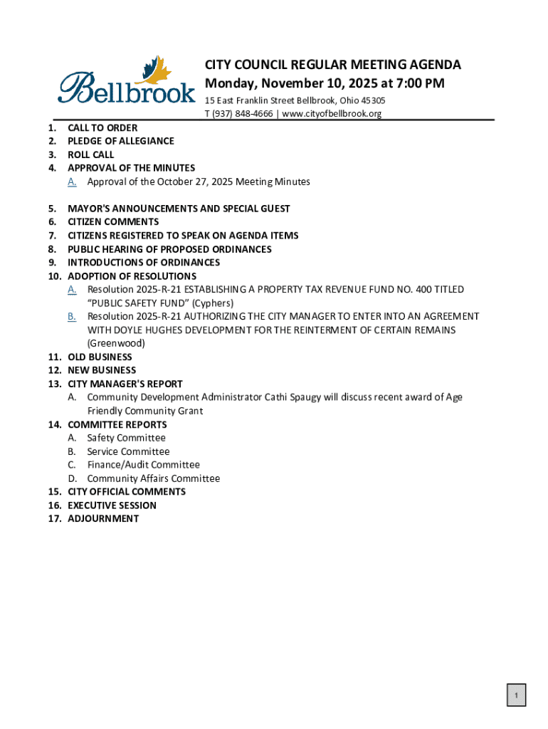 CITY COUNCIL REGULAR MEETING AGENDA Monday, November 10, 2025 at 7:00 PM 15 East Franklin Street Bellbrook, Ohio 45305 T (937) 8484666 | www.cityofbellbrook.org1. 2. 3. 4.CALL TO ORDER PLEDGE OF ALLEGIANCE