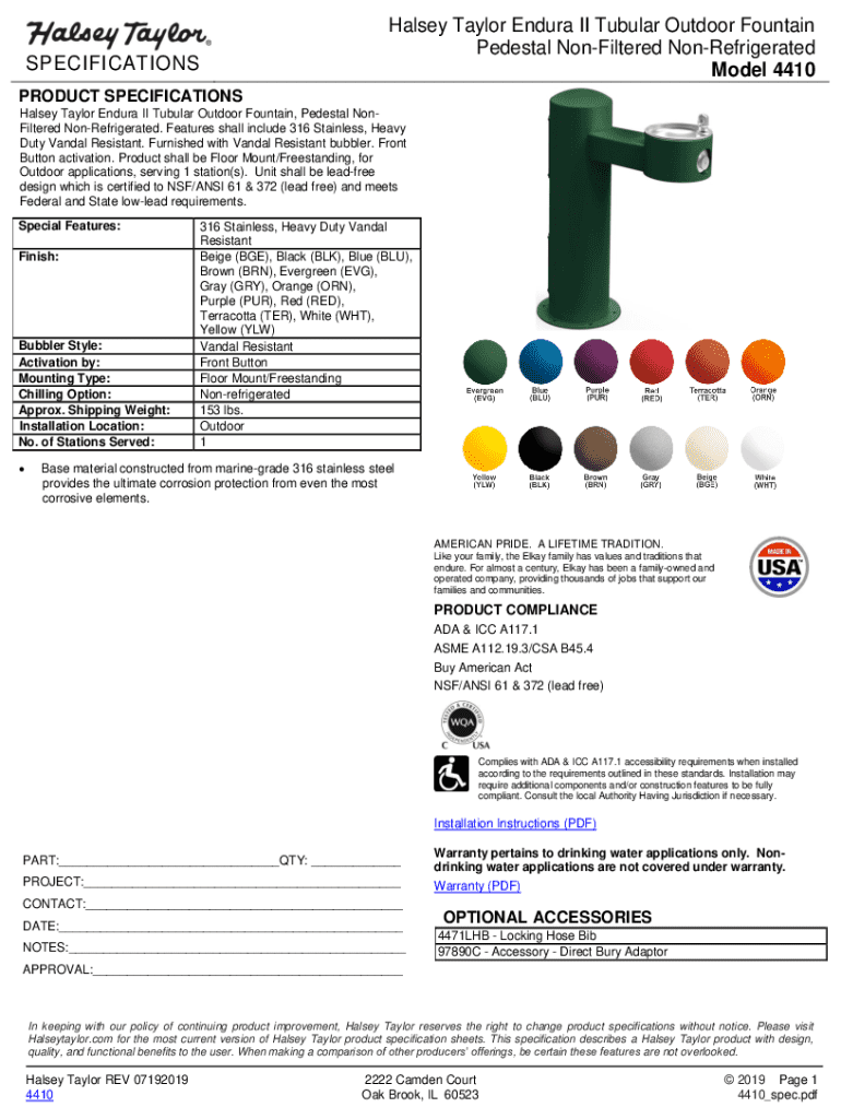 The Halsey Taylor Endura II Form is an essential document used in the management and operation of Halsey Taylor's state-of-the-art drinking facilities, designed to enhance hydration in both commercial and residential settings. This form serves various purposes, from installation specifications to maintenance requests, ensuring that users can easily access clean and refreshing water from bottle filling stations.