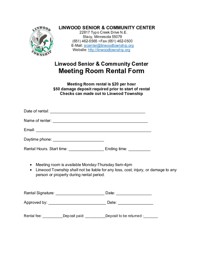 Individuals or organizations that wish to reserve a meeting room for events or gatherings are required to complete and file a meeting room rental form.