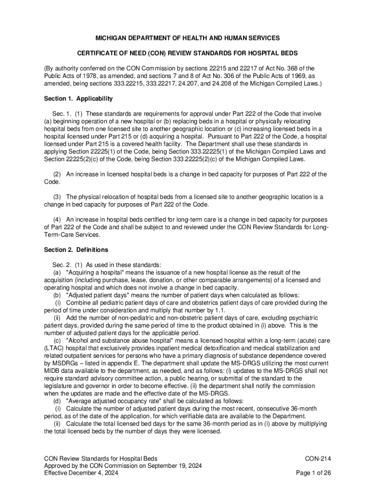 MICHIGAN DEPARTMENT OF HEALTH AND HUMAN SERVICES CERTIFICATE OF NEED (CON) REVIEW STANDARDS FOR HOSPITAL BEDS (By authority conferred on the CON Commission by sections 22215 and 22217 of Act No. 368