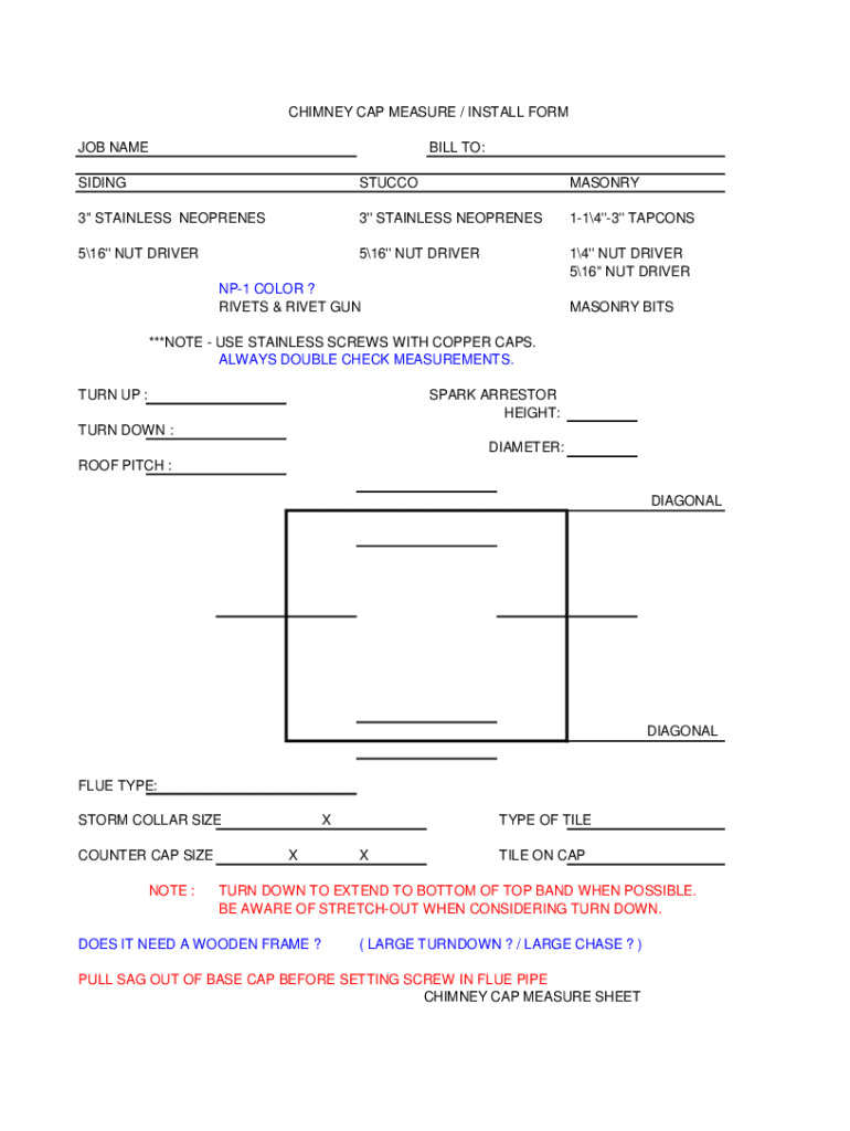 Inaccurate measurements can lead to gaps, leaks, or an improper fit, resulting in a chimney cap that serves its purpose poorly. Whether you are a DIY enthusiast or seeking professional help, understanding the importance of the chimney cap measure sheet form will streamline the installation process and ensure that your chimney performs optimally.