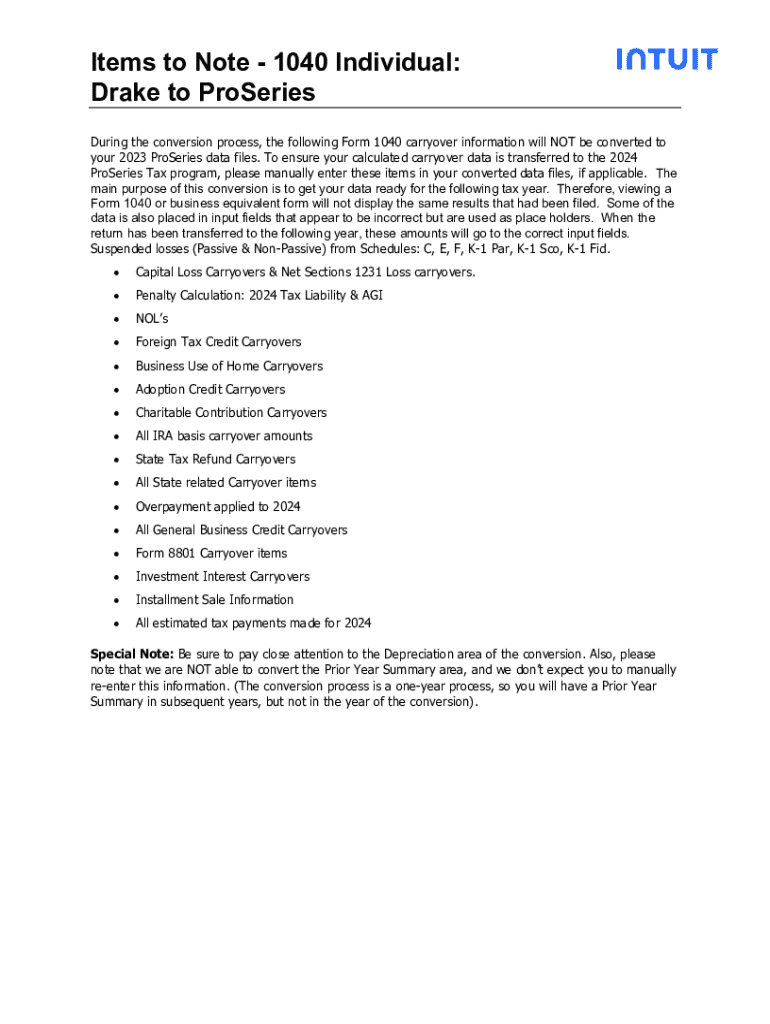 Items to Note1040 Individual: Drake to ProSeries During the conversion process, the following Form 1040 carryover information will NOT be converted to your 2023 ProSeries data files. To ensure your