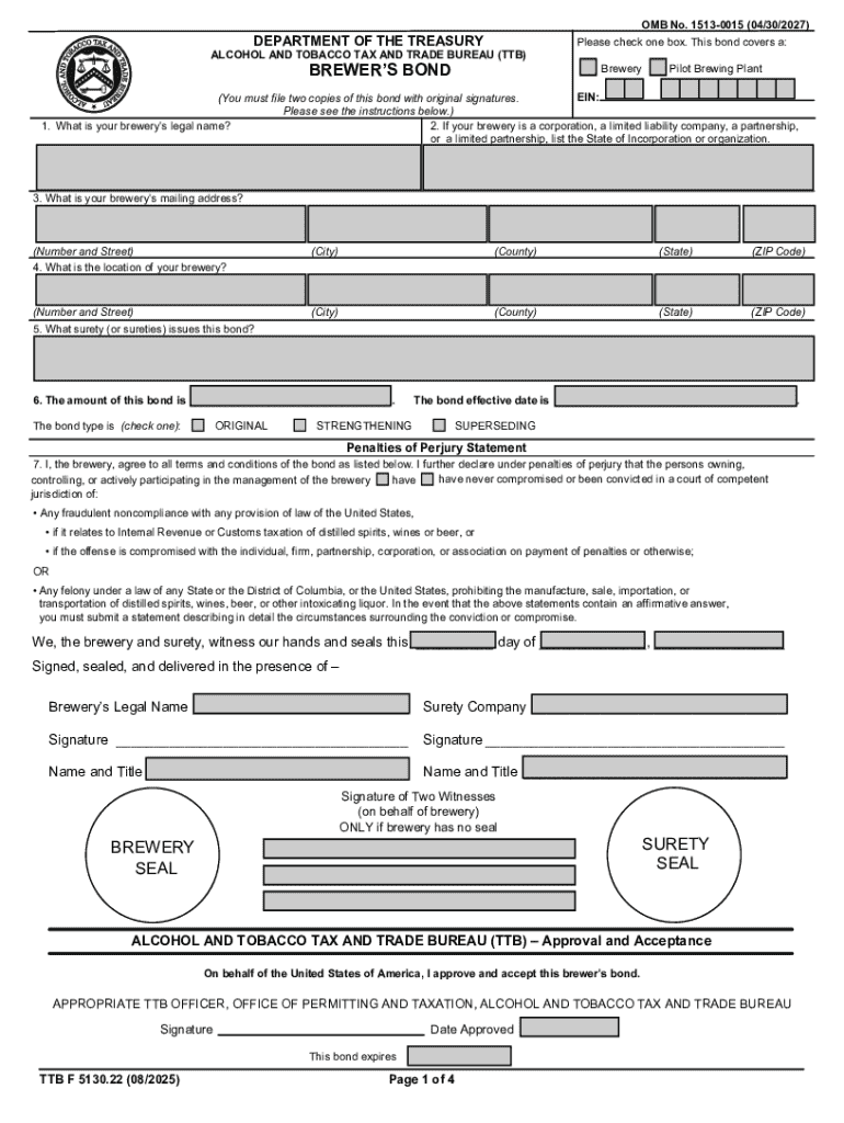 OMB No. 15130015 (04/30/2027)DEPARTMENT OF THE TREASURYALCOHOL AND TOBACCO TAX AND TRADE BUREAU (TTB)BREWERS BONDPlease check one box. This bond covers a: BreweryPilot Brewing PlantEIN: (You must