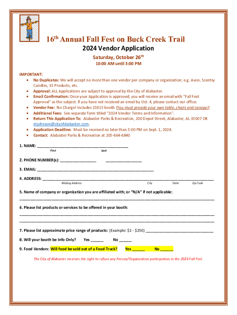 This year promises to be even more exciting as the Fall Fest will feature new attractions like a corn maze and interactive workshops. The registration form is crucial in helping organizers prepare adequately, ensuring a smooth experience for everyone involved. Participants can look forward to not just food and fun but also opportunities to create lasting memories.