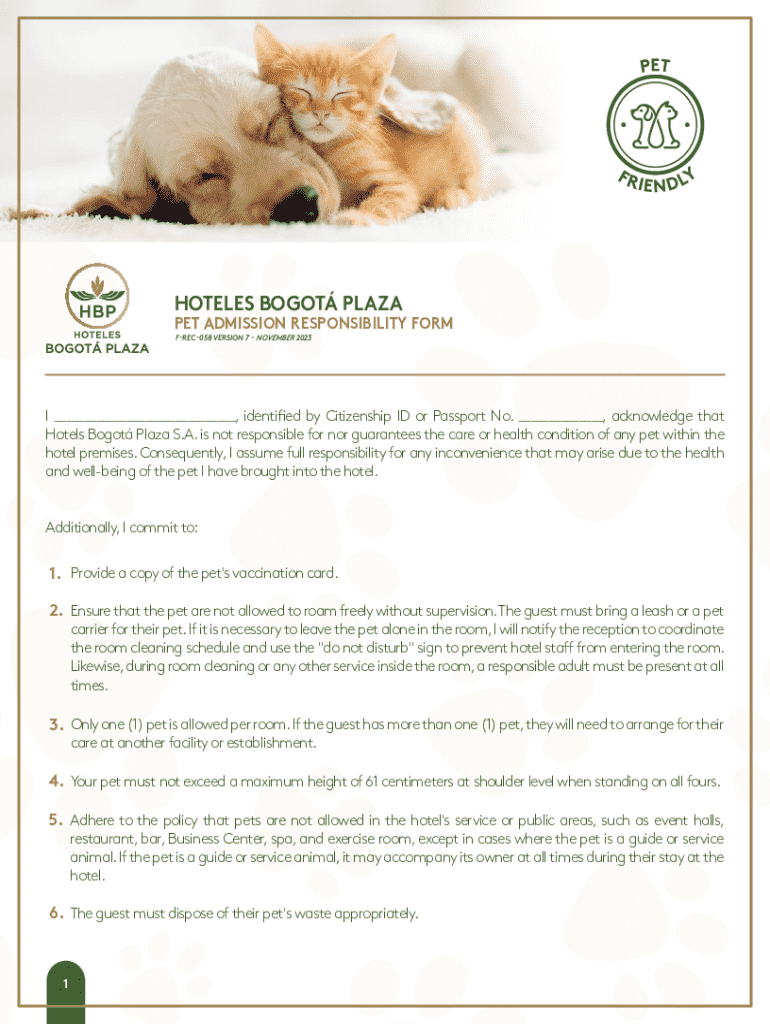 HOTELES BOGOT PLAZAPET ADMISSION RESPONSIBILITY FORM FREC058 VERSION 7NOVEMBER 2023I ___, identified by Citizenship ID or Passport No. ___, acknowledge that Hotels Bogot Plaza S.A. is not responsible
