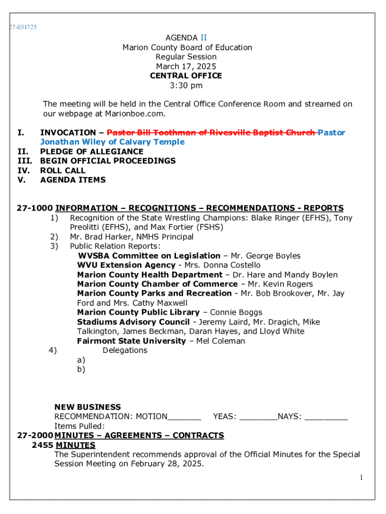 27031725AGENDA II Marion County Board of Education Regular Session March 17, 2025 CENTRAL OFFICE 3:30 pm The meeting will be held in the Central Office Conference Room and streamed on our webpage