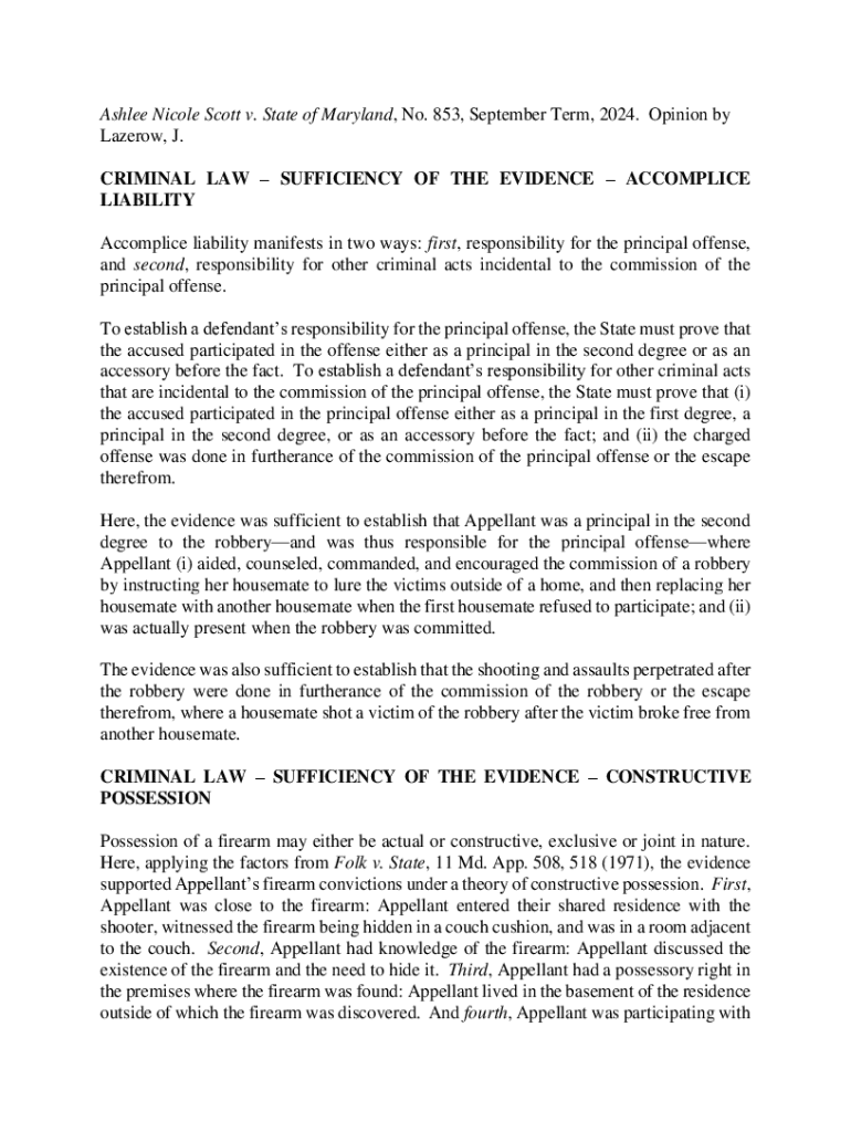 Ashlee Nicole Scott v. State of Maryland, No. 853, September Term, 2024. Opinion by Lazerow, J. CRIMINAL LAWSUFFICIENCY OF THE EVIDENCEACCOMPLICE LIABILITY Accomplice liability manifests in two ways: