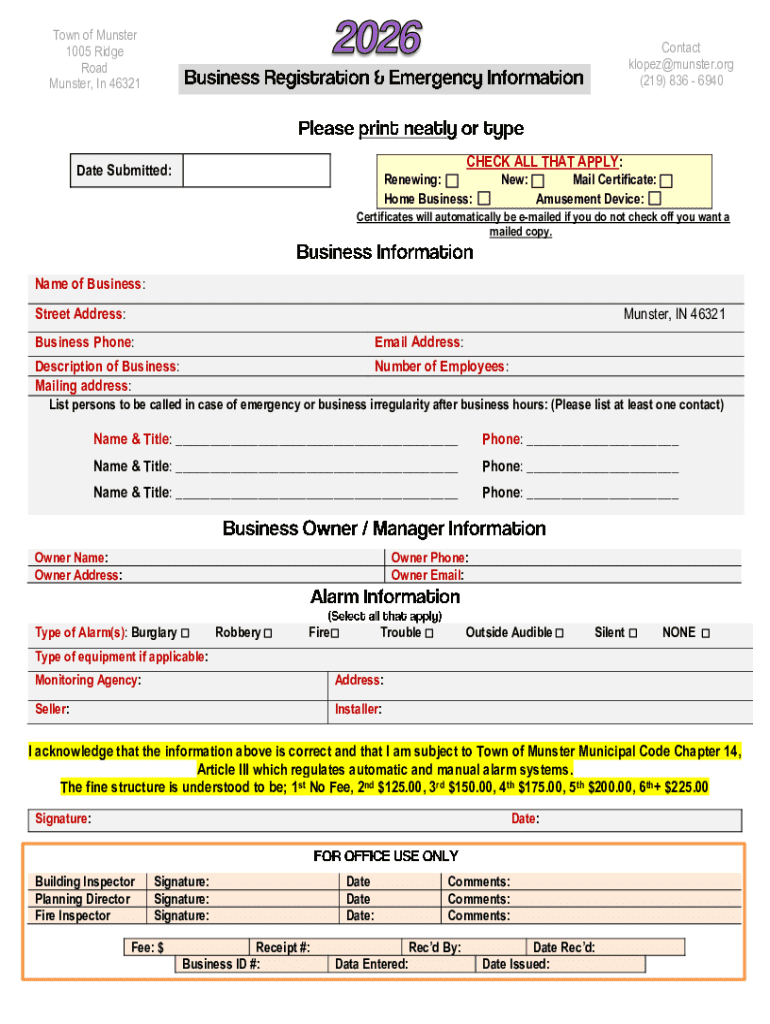 CONTRACTORS IN MUNSTER YOU WILL NEED TO FILE LICENSING PAPERWORK WITH COMMUNITY DEVELOPMENTIF YOU HAVE A GAMING DEVICE IN YOUR BUSINESS, PLEASE CHECK THE BOX ON THE REGISTRATIONTown of Munster 1005