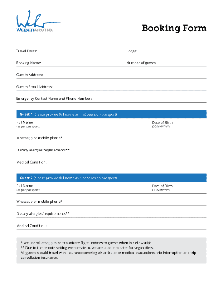 Booking Form Travel Dates:Lodge:Booking Name:Number of guests:Guests Address: Guests Email Address: Emergency Contact Name and Phone Number:Guest 1 (please provide full name as it appears on passport)