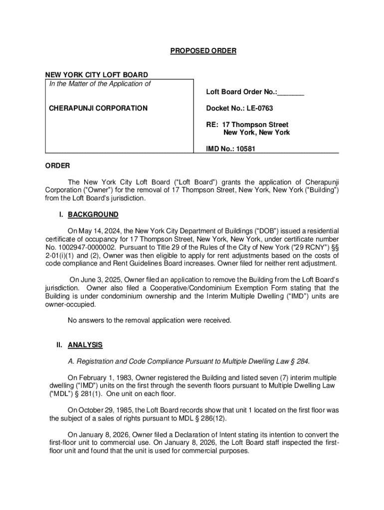 Proposed orders are crucial within the realm of loft law, serving as formal requests submitted to the Loft Board. These documents articulate specific demands or adjustments that a property owner or tenant is seeking to enforce or address under the Loft Law framework. The Loft Law itself is designed to provide a form of protection for residential tenants occupying commercial loft spaces, particularly in New York City, where zoning laws were historically more lenient.