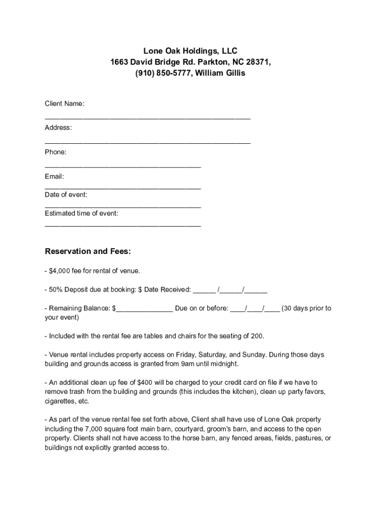 Lone Oak Holdings, LLC 1663 David Bridge Rd. Parkton, NC 28371, (910) 8505777, William GillisClient Name: ___ Address: ___ Phone: ___ Email: ___ Date of event: ___ Estimated time of event: ___Reservation