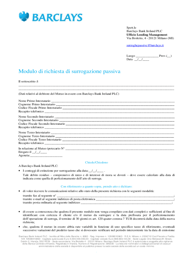 Ottieni il gratuito Modulo di richiesta di surrogazione passivaBarclays Bank Ireland ...