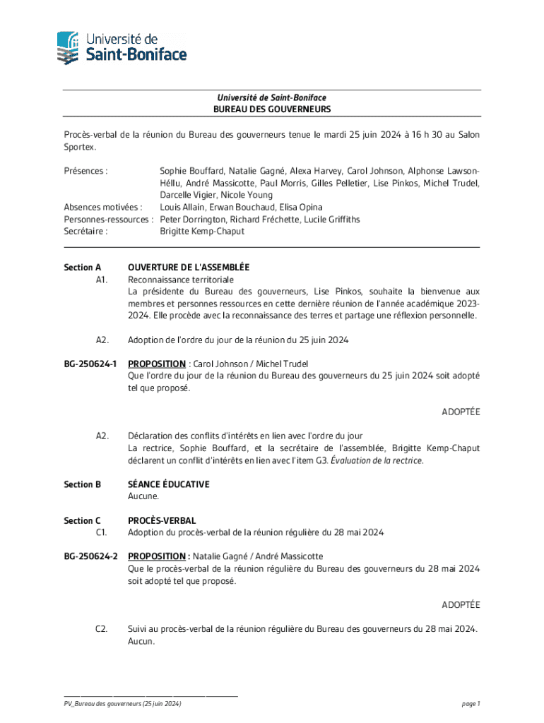 Universit de SaintBoniface BUREAU DES GOUVERNEURS Procsverbal de la runion du Bureau des gouverneurs tenue le mardi 25 juin 202416 h 30 au Salon Sportex. Prsences :Sophie Bouffard, Natalie Gagn, Alexa