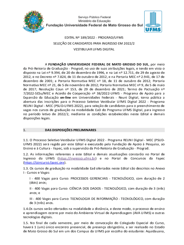 EDITALN 189/2022PROGRAD/UFMS SELEO DE CANDIDATOS PARA INGRESSO EM 2022/2 VESTIBULAR UFMS DIGITALA FUNDAO UNIVERSIDADE FEDERAL DE MATO GROSSO DO SUL, por meio da PrReitoria de GraduaoPrograd, no uso