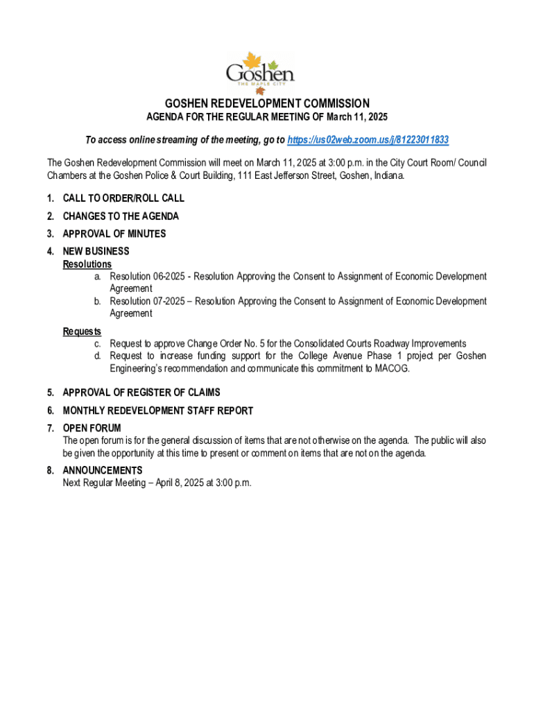 Get the free Redevelopment Commission - City of Goshen, Indiana
