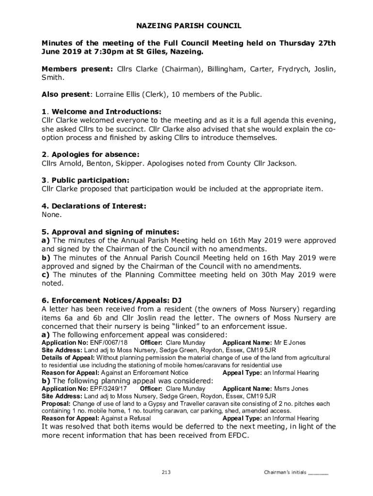 NAZEING PARISH COUNCIL Minutes of the meeting of the Full Council Meeting held on Thursday 27th June 2019 at 7:30pm at St Giles, Nazeing. Members present: Cllrs Clarke (Chairman), Billingham, Carter,