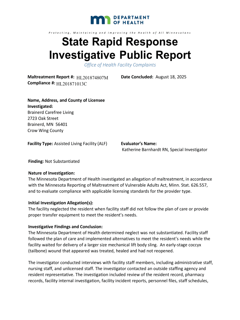 Get the free Investigating a Report or Complaint - MN Dept. of Health