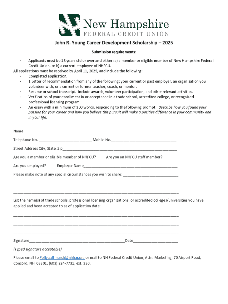 John R. Young Career Development Scholarship2025 Submission requirements: Applicants must be 18 years old or over and either: a) a member or eligible member of New Hampshire Federal Credit Union,