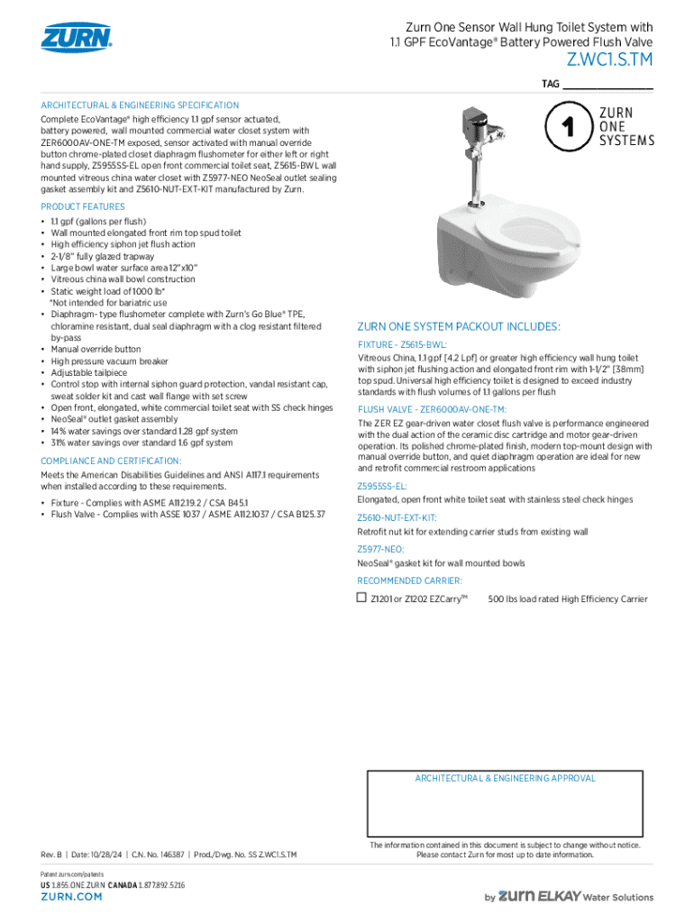 Zurn One Sensor Wall Hung Toilet System with 1.1 GPF EcoVantage Battery Powered Flush ValveZ.WC1.S.TMTAG ___ ARCHITECTURAL & ENGINEERING SPECIFICATION Complete EcoVantage high efficiency 1.1 gpf sensor