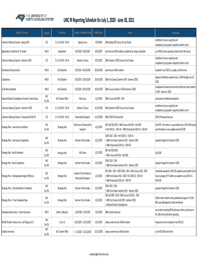 UNC IR Reporting Schedule for July 1, 2020June 30, 2021 Report or SurveyCategoryReferenceCampus Completion DatePublish DateSourceCommon FollowUp SystemSpring 2020CFSG.S.96309635Spring Census7/20/2020SDM