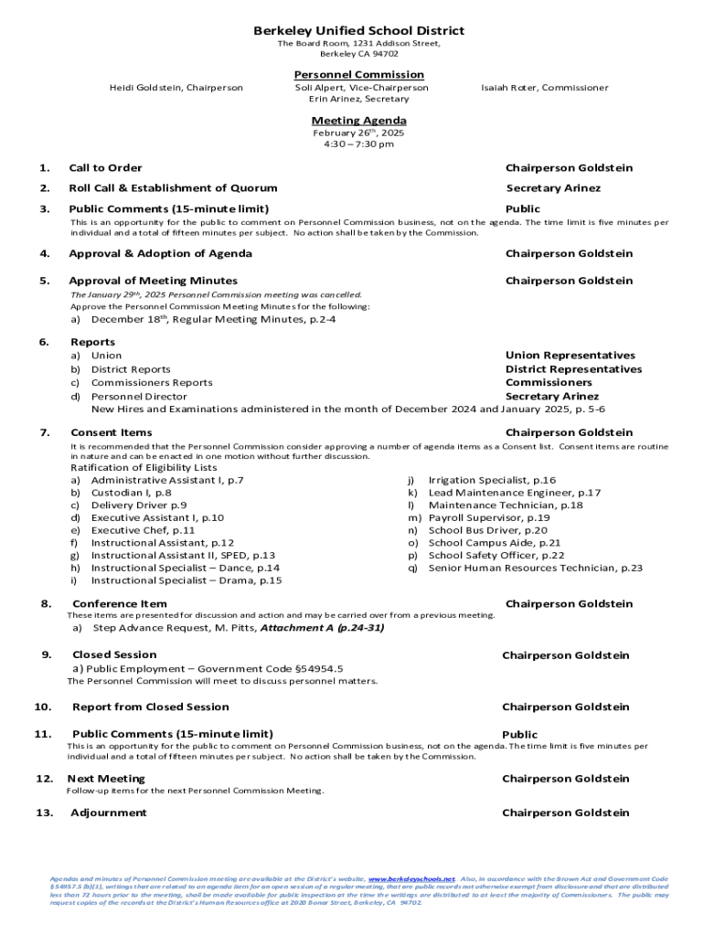 Berkeley Unified School District The Board Room, 1231 Addison Street, Berkeley CA 94702Heidi Goldstein, ChairpersonPersonnel CommissionSoli Alpert, ViceChairperson Erin Arinez, SecretaryIsaiah Roter,