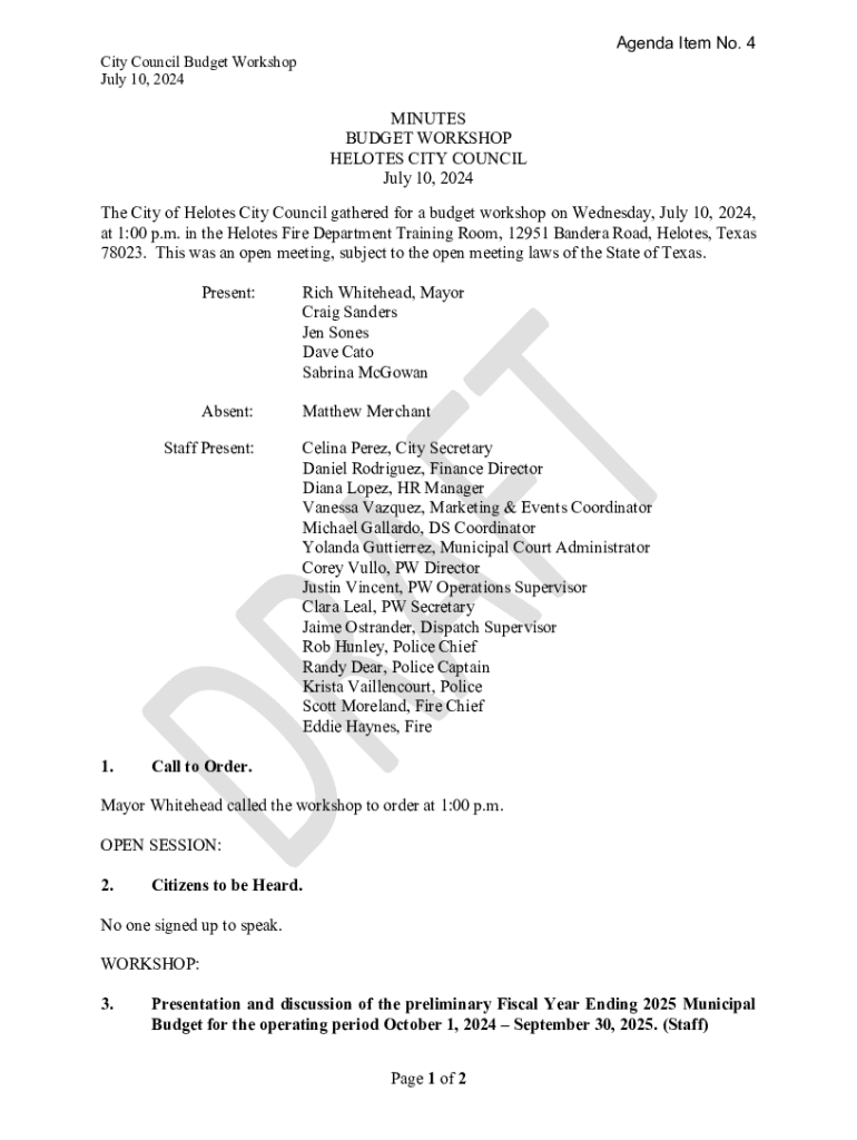 Get the free The City of Helotes City Council gathered for a budget workshop on Wednesday, July 1...
