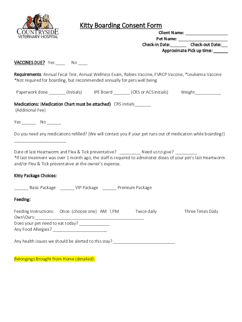 Kitty Boarding Consent FormClient Name: ___ Pet Name: ___ Checkin Date: Checkout Date: Approximate Pick up time: ___VACCINES DUE? Yes ___No ___Requirements: Annual Fecal Test, Annual Wellness Exam,