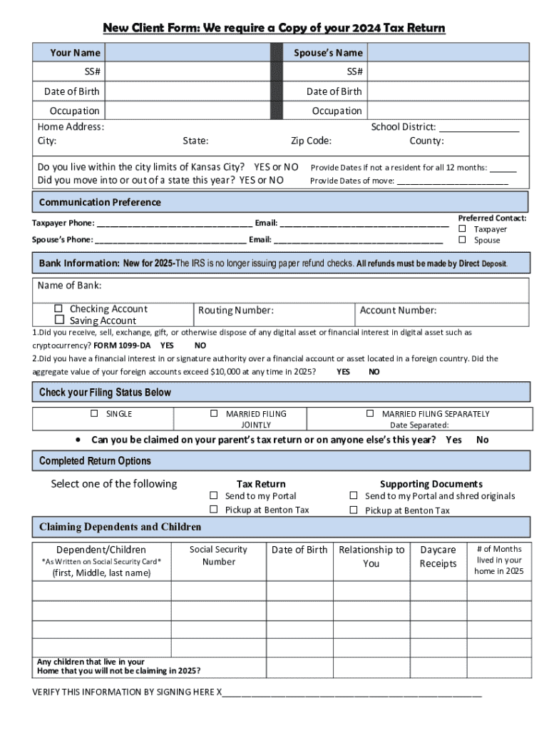 New Client Form: We require a Copy of your 2024 Tax Return Your NameSpouses NameSS#SS#Date of BirthDate of BirthOccupation Home Address: City:Occupation State:Zip Code:Do you live within the city