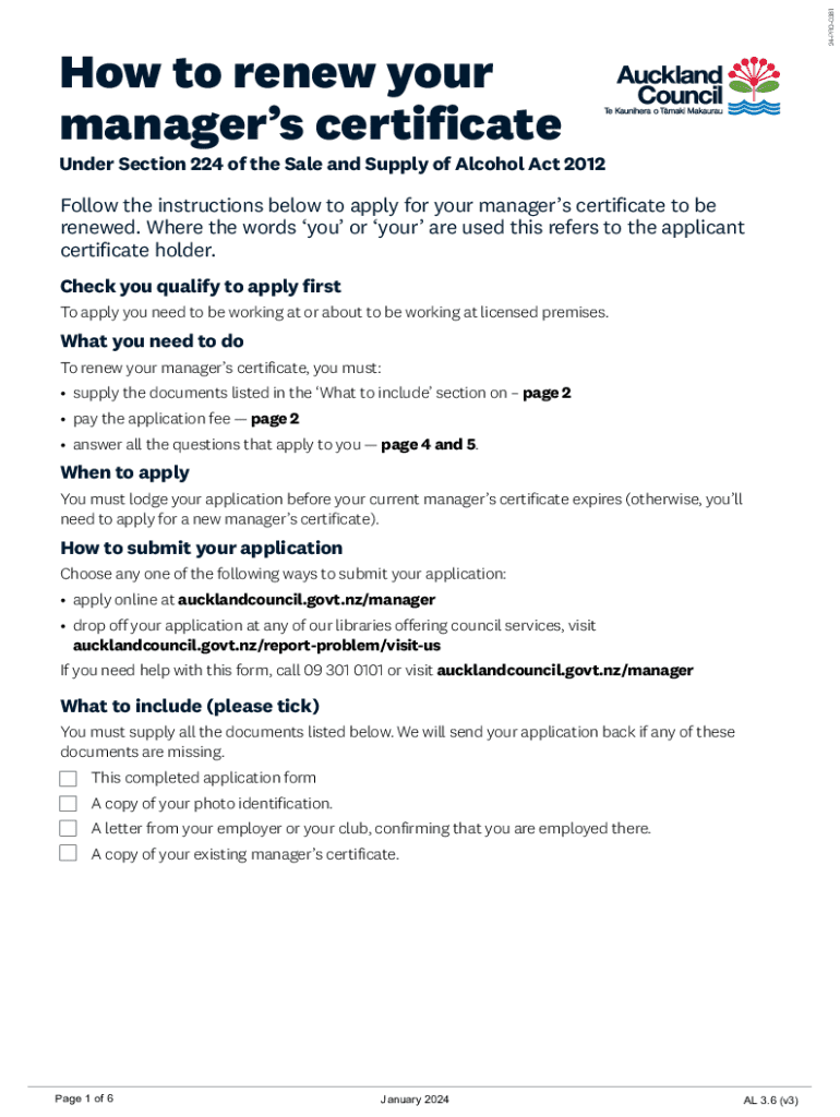 24PRO0381How to renew your managers certificate Under Section 224 of the Sale and Supply of Alcohol Act 2012Follow the instructions below to apply for your managers certificate to be renewed. Where