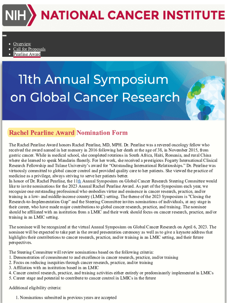 The selection process for the Rachel Pearline Award includes a rigorous evaluation by a steering committee composed of experts in the field. Judging criteria prioritize innovation, leadership, and measurable contributions to cancer care. Understanding these benchmarks can help nominators tailor their applications to align with what makes a nomination stand out.