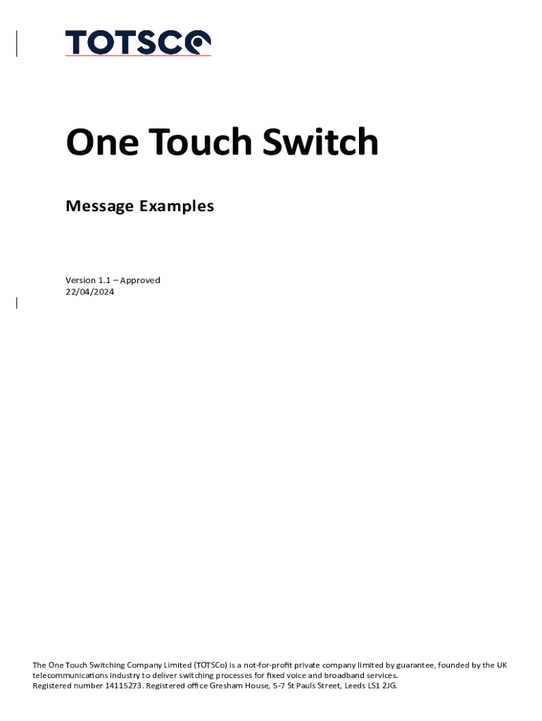 One Touch Switch Message ExamplesVersion 1.1Approved 22/04/2024The One Touch Switching Company Limited (TOTSCo) is a notforprofit private company limited by guarantee, founded by the UK telecommunications