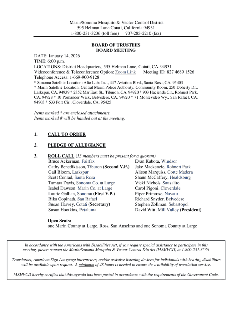Marin/Sonoma Mosquito & Vector Control District 595 Helman Lane Cotati, California 94931 18002313236 (toll free) 7072852210 (fax) BOARD OF TRUSTEES BOARD MEETING DATE: January 14, 2026 TIME: 6:00