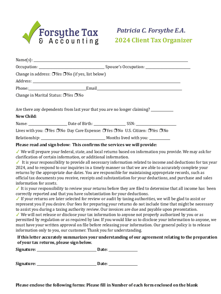 Patricia C. Forsythe E.A. 2024 Client Tax Organizer Name(s): ___ Occupation: ___ Spouses Occupation: ___ Change in address: Yes No (if yes, list below) Address: ___ Phone:___Email___ Change in Marital