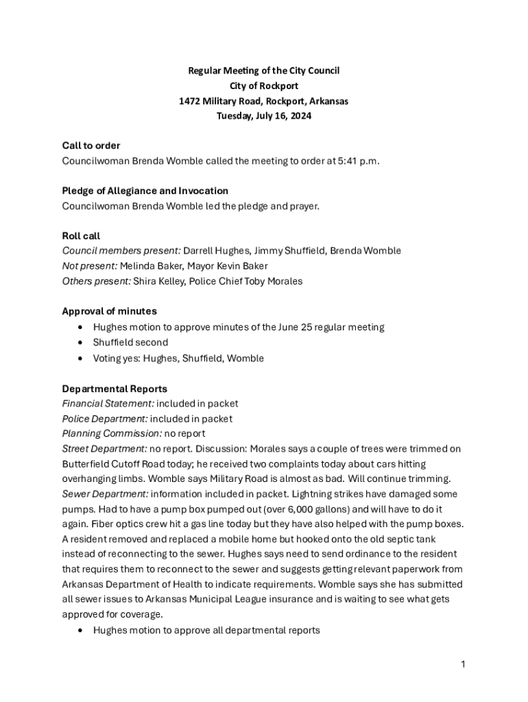 Regular Meeting of the City Council City of Rockport 1472 Military Road, Rockport, Arkansas Tuesday, July 16, 2024 Call to order Councilwoman Brenda Womble called the meeting to order at 5:41 p.m.