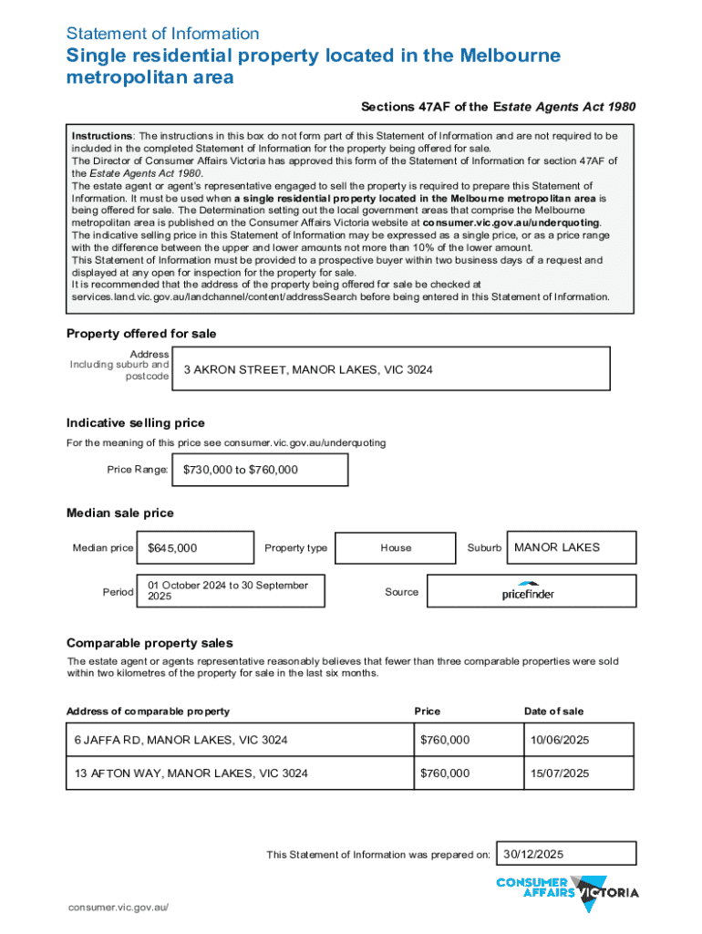 Get the free 3 AKRON STREET, MANOR LAKES, VIC 3024