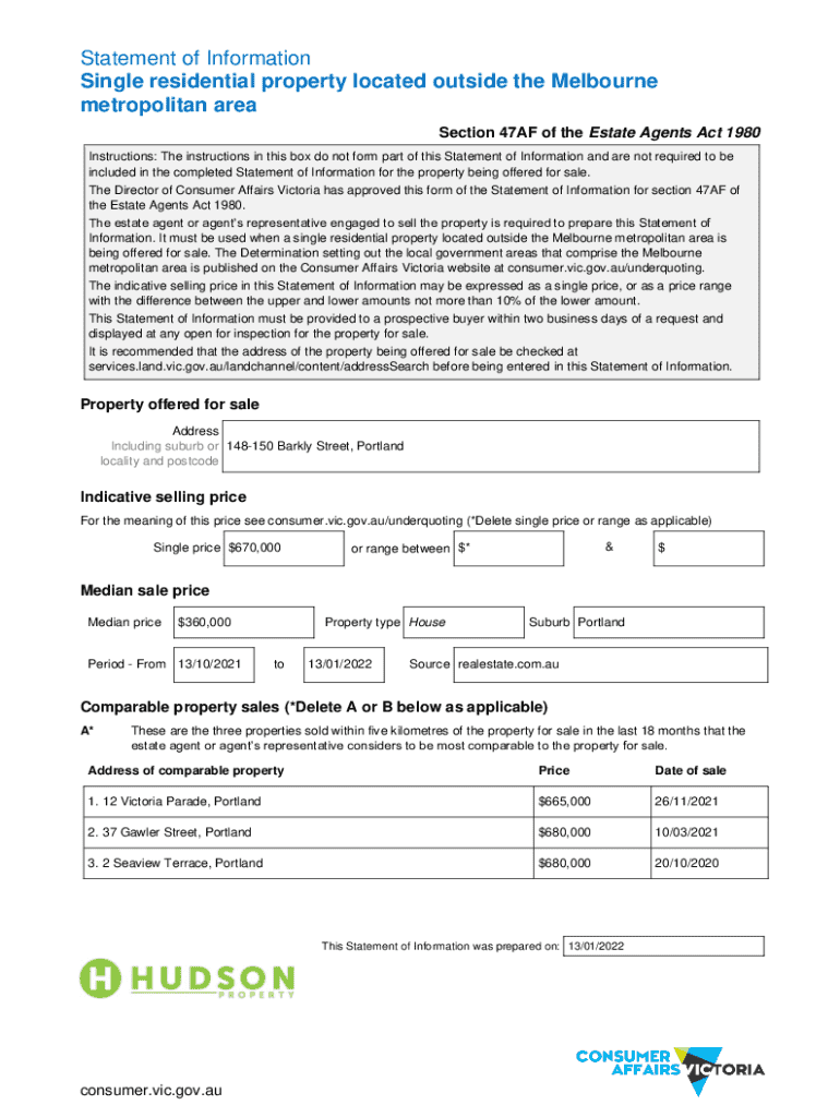Statement of Information Single residential property located outside the Melbourne metropolitan area Section 47AF of the Estate Agents Act 1980 Instructions: The instructions in this box do not form