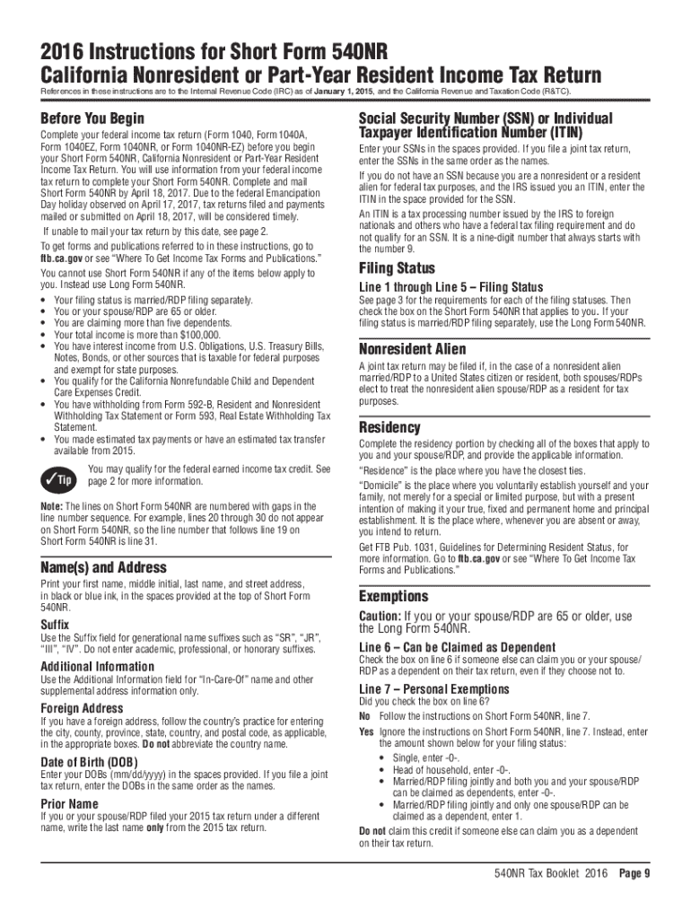 2016 Instructions for Short Form 540NR California Nonresident or PartYear Resident Income Tax Return References in these instructions are to the Internal Revenue Code (IRC) as of January 1, 2015,