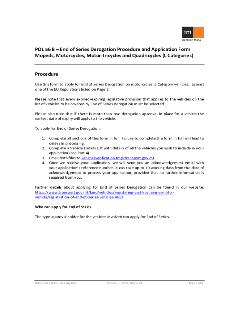 Completing the end of series derogation form isn’t the only step in the application process; accompanying documentation is essential. Applicants must compile a list of required documents to fortify their case. This typically includes technical specifications, proof of previous compliance, and any correspondence with the vehicle certification agency regarding the request for derogation.