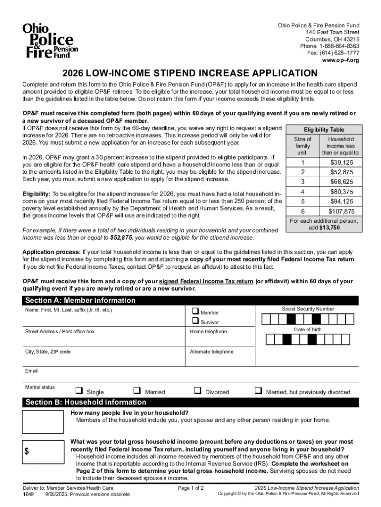 Ohio Police & Fire Pension Fund 140 East Town Street Columbus, OH 43215 Phone: 18888648363 Fax: (614) 6281777 www.opf.org2026 LOWINCOME STIPEND INCREASE APPLICATION Complete and return this form to