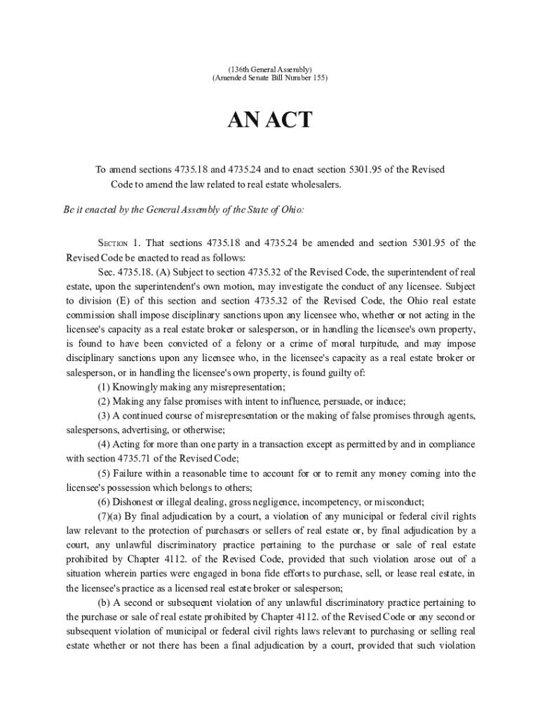 Ohio SB155 is a significant piece of legislation aimed at streamlining real estate transactions and enhancing consumer protections within the state's property market. This bill reflects ongoing efforts to address the complexities of real estate wholesaling by revising necessary forms to make them clearer and more accessible.