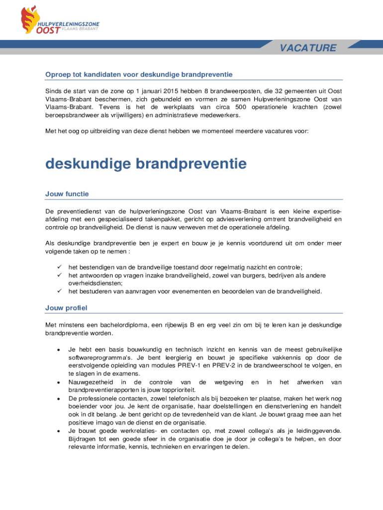 VACATURE Oproep tot kandidaten voor deskundige brandpreventie Sinds de start van de zone op 1 januari 2015 hebben 8 brandweerposten, die 32 gemeenten uit Oost VlaamsBrabant beschermen, zich gebundeld
